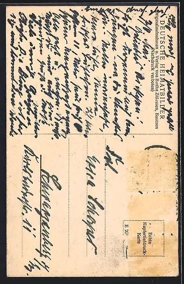 Personenbezogene Daten auf der Rückseite der Karte wurden durch blauen Textmarker unkenntlich gemacht. Die blauen Stellen sind auf die Vorderseite durchgeweicht und wirken sich negativ auf das Postkartenfoto aus