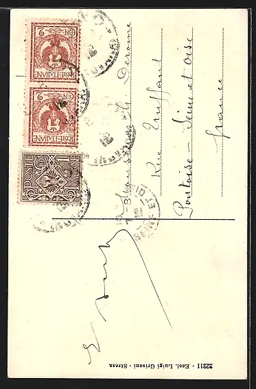 Personenbezogene Daten auf der Rückseite der Karte wurden durch blauen Textmarker unkenntlich gemacht. Die blauen Stellen sind auf die Vorderseite durchgeweicht und wirken sich negativ auf das Postkartenfoto aus