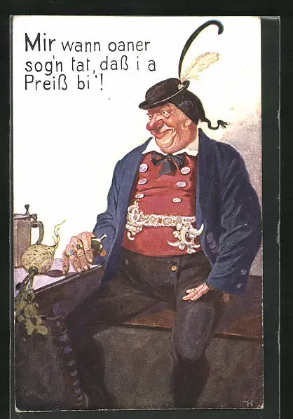 AK Bayer in Tracht auf Bank, Scherz