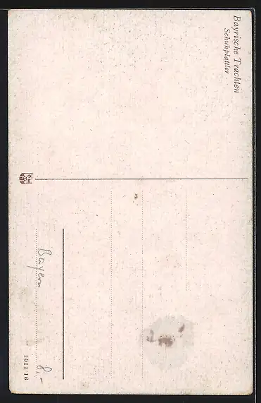 Personenbezogene Daten auf der Rückseite der Karte wurden durch blauen Textmarker unkenntlich gemacht. Die blauen Stellen sind auf die Vorderseite durchgeweicht und wirken sich negativ auf das Postkartenfoto aus