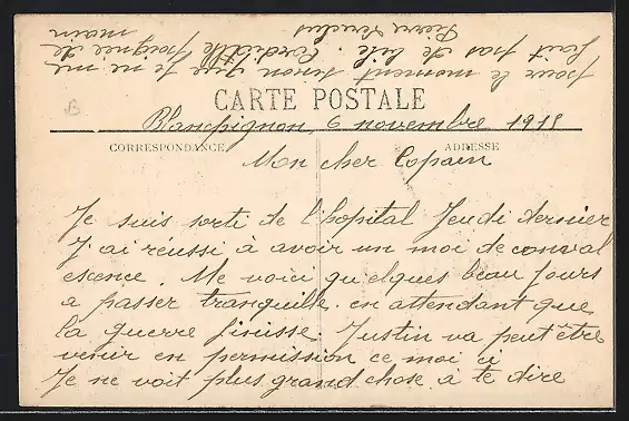 Personenbezogene Daten auf der Rückseite der Karte wurden durch blauen Textmarker unkenntlich gemacht. Die blauen Stellen sind auf die Vorderseite durchgeweicht und wirken sich negativ auf das Postkartenfoto aus
