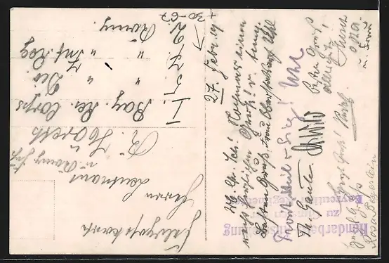 Personenbezogene Daten auf der Rückseite der Karte wurden durch blauen Textmarker unkenntlich gemacht. Die blauen Stellen sind auf die Vorderseite durchgeweicht und wirken sich negativ auf das Postkartenfoto aus