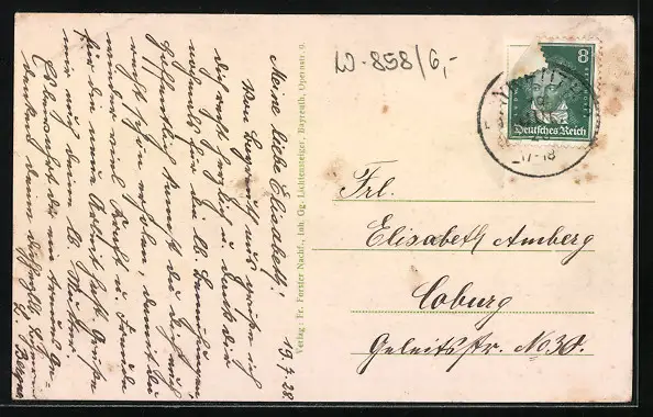 alte Ansichtskarte, gelaufen 1928, Briefmarke entfernt, rückseitig Oberflächenschaden, guter Zustand