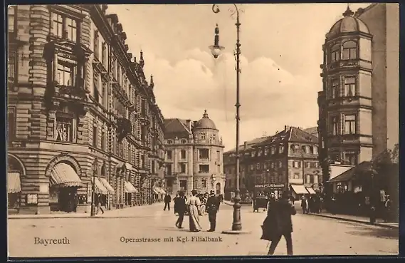 AK Bayreuth, Opernstrasse mit Kgl. Filialbank