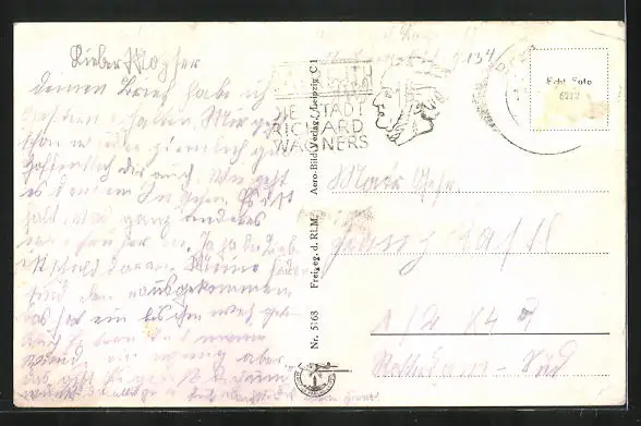 Personenbezogene Daten auf der Rückseite der Karte wurden durch blauen Textmarker unkenntlich gemacht. Die blauen Stellen sind auf die Vorderseite durchgeweicht und wirken sich negativ auf das Postkartenfoto aus