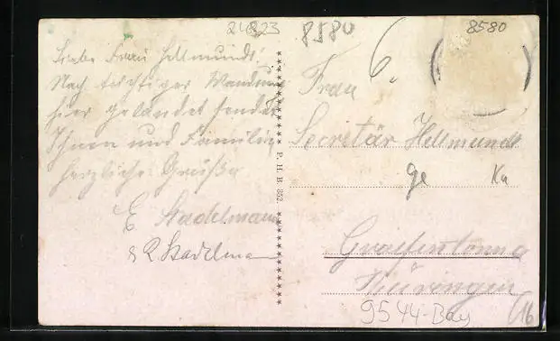 Personenbezogene Daten auf der Rückseite der Karte wurden durch blauen Textmarker unkenntlich gemacht. Die blauen Stellen sind auf die Vorderseite durchgeweicht und wirken sich negativ auf das Postkartenfoto aus