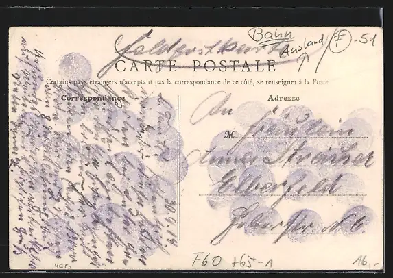 Personenbezogene Daten auf der Rückseite der Karte wurden durch blauen Textmarker unkenntlich gemacht. Die blauen Stellen sind auf die Vorderseite durchgeweicht und wirken sich negativ auf das Postkartenfoto aus