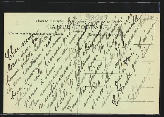 Personenbezogene Daten auf der Rückseite der Karte wurden durch blauen Textmarker unkenntlich gemacht. Die blauen Stellen sind auf die Vorderseite durchgeweicht und wirken sich negativ auf das Postkartenfoto aus
