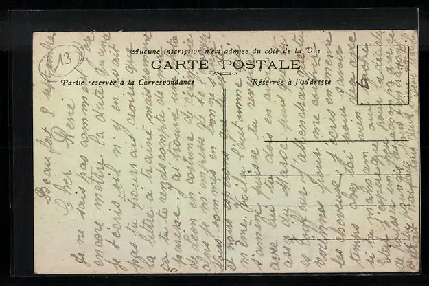 Personenbezogene Daten auf der Rückseite der Karte wurden durch blauen Textmarker unkenntlich gemacht. Die blauen Stellen sind auf die Vorderseite durchgeweicht und wirken sich negativ auf das Postkartenfoto aus