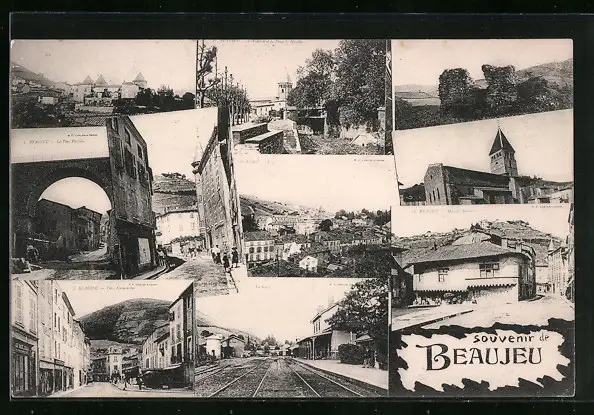 AK Beaujeu, Le Pont Paradis, Place Clémentine, La Gare, Maison Ancienne, Vue générale