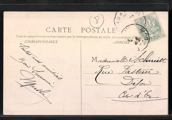 Personenbezogene Daten auf der Rückseite der Karte wurden durch blauen Textmarker unkenntlich gemacht. Die blauen Stellen sind auf die Vorderseite durchgeweicht und wirken sich negativ auf das Postkartenfoto aus