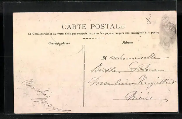 Personenbezogene Daten auf der Rückseite der Karte wurden durch blauen Textmarker unkenntlich gemacht. Die blauen Stellen sind auf die Vorderseite durchgeweicht und wirken sich negativ auf das Postkartenfoto aus