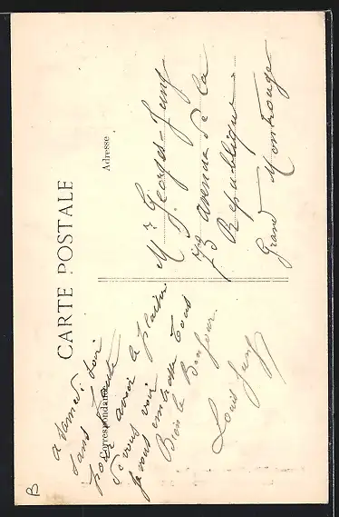 Personenbezogene Daten auf der Rückseite der Karte wurden durch blauen Textmarker unkenntlich gemacht. Die blauen Stellen sind auf die Vorderseite durchgeweicht und wirken sich negativ auf das Postkartenfoto aus
