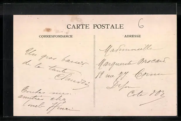 Personenbezogene Daten auf der Rückseite der Karte wurden durch blauen Textmarker unkenntlich gemacht. Die blauen Stellen sind auf die Vorderseite durchgeweicht und wirken sich negativ auf das Postkartenfoto aus