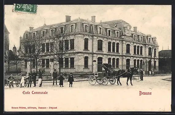 AK Beaune, École Communale avec une calèche et des passants