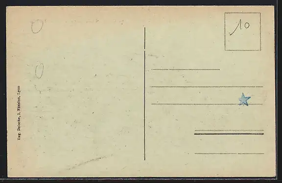 Personenbezogene Daten auf der Rückseite der Karte wurden durch blauen Textmarker unkenntlich gemacht. Die blauen Stellen sind auf die Vorderseite durchgeweicht und wirken sich negativ auf das Postkartenfoto aus