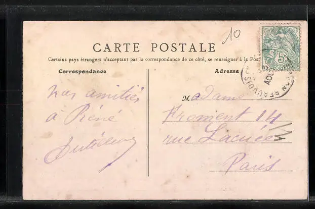 Personenbezogene Daten auf der Rückseite der Karte wurden durch blauen Textmarker unkenntlich gemacht. Die blauen Stellen sind auf die Vorderseite durchgeweicht und wirken sich negativ auf das Postkartenfoto aus