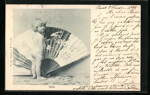 AK Bébé, nacktes Kind steht vor einem Fächer