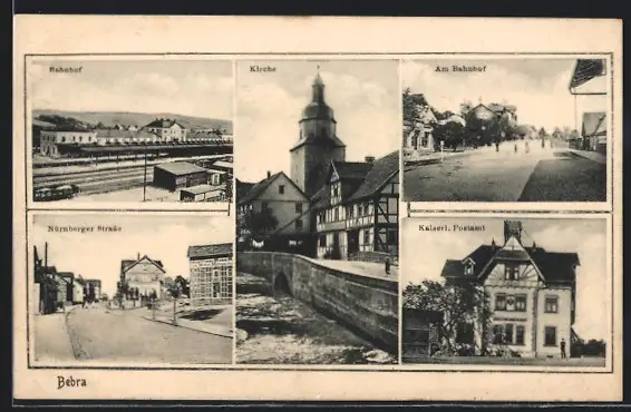 AK Bebra, Bahnhof, Kirche, Nürnberger Strasse, Kaiserl. Postamt