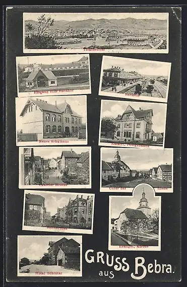 AK Bebra, Totalansicht, Bahnhof, kaiserliches Postgebäude, unter der Linde, neues Schulhaus