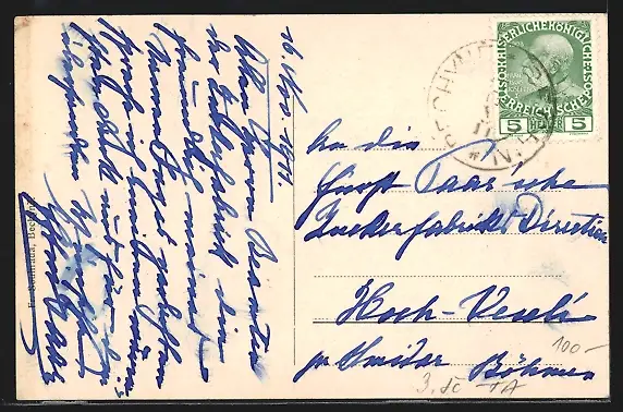 Personenbezogene Daten auf der Rückseite der Karte wurden durch blauen Textmarker unkenntlich gemacht. Die blauen Stellen sind auf die Vorderseite durchgeweicht und wirken sich negativ auf das Postkartenfoto aus