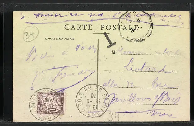 Personenbezogene Daten auf der Rückseite der Karte wurden durch blauen Textmarker unkenntlich gemacht. Die blauen Stellen sind auf die Vorderseite durchgeweicht und wirken sich negativ auf das Postkartenfoto aus
