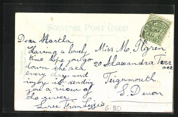 Personenbezogene Daten auf der Rückseite der Karte wurden durch blauen Textmarker unkenntlich gemacht. Die blauen Stellen sind auf die Vorderseite durchgeweicht und wirken sich negativ auf das Postkartenfoto aus