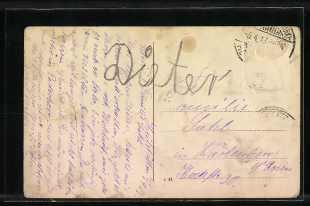 gelaufen 1917, Briefmarke entfernt, rückseitig Oberflächenschaden, Eckknick re. oben, Bugspur re. oben, guter Zustand