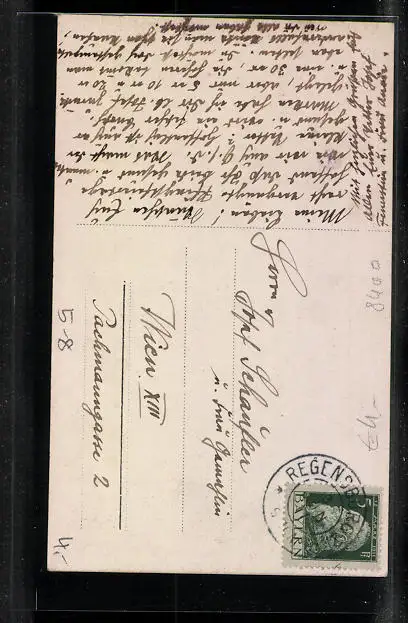 Personenbezogene Daten auf der Rückseite der Karte wurden durch blauen Textmarker unkenntlich gemacht. Die blauen Stellen sind auf die Vorderseite durchgeweicht und wirken sich negativ auf das Postkartenfoto aus