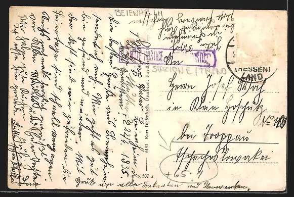 Personenbezogene Daten auf der Rückseite der Karte wurden durch blauen Textmarker unkenntlich gemacht. Die blauen Stellen sind auf die Vorderseite durchgeweicht und wirken sich negativ auf das Postkartenfoto aus