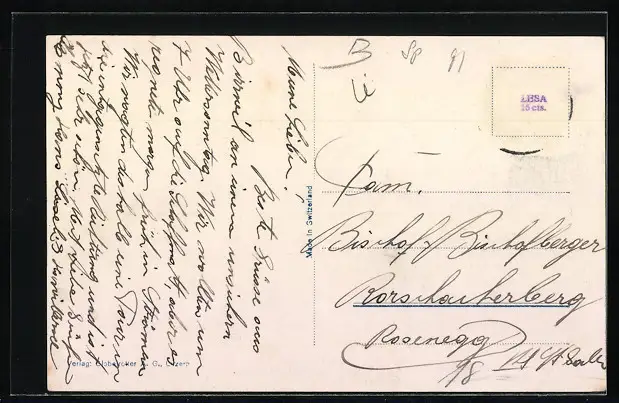 Personenbezogene Daten auf der Rückseite der Karte wurden durch blauen Textmarker unkenntlich gemacht. Die blauen Stellen sind auf die Vorderseite durchgeweicht und wirken sich negativ auf das Postkartenfoto aus