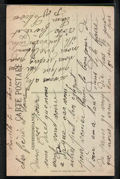 Personenbezogene Daten auf der Rückseite der Karte wurden durch blauen Textmarker unkenntlich gemacht. Die blauen Stellen sind auf die Vorderseite durchgeweicht und wirken sich negativ auf das Postkartenfoto aus