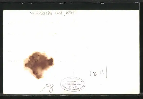 Personenbezogene Daten auf der Rückseite der Karte wurden durch blauen Textmarker unkenntlich gemacht. Die blauen Stellen sind auf die Vorderseite durchgeweicht und wirken sich negativ auf das Postkartenfoto aus