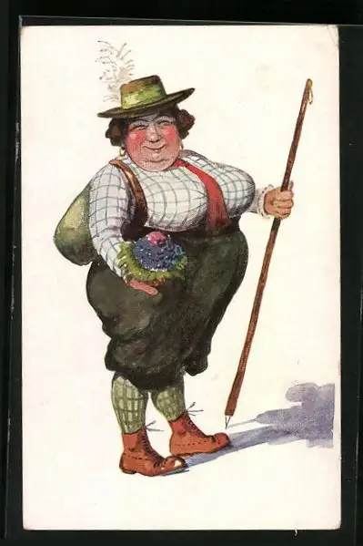 AK Beleibte Frau in Wanderkleidung mit Stock