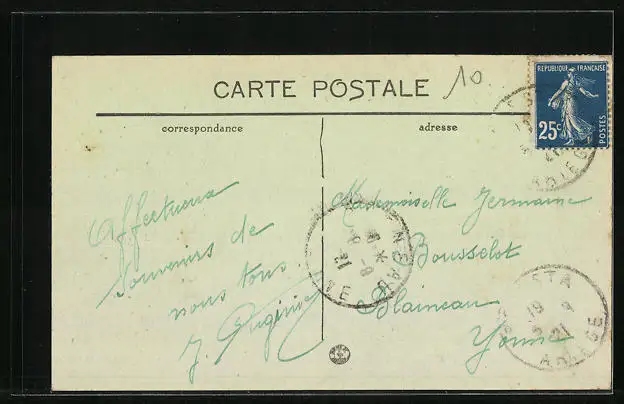 Personenbezogene Daten auf der Rückseite der Karte wurden durch blauen Textmarker unkenntlich gemacht. Die blauen Stellen sind auf die Vorderseite durchgeweicht und wirken sich negativ auf das Postkartenfoto aus