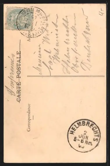 Personenbezogene Daten auf der Rückseite der Karte wurden durch blauen Textmarker unkenntlich gemacht. Die blauen Stellen sind auf die Vorderseite durchgeweicht und wirken sich negativ auf das Postkartenfoto aus