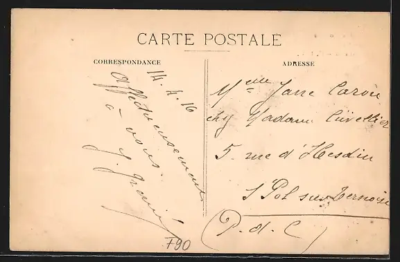 Personenbezogene Daten auf der Rückseite der Karte wurden durch blauen Textmarker unkenntlich gemacht. Die blauen Stellen sind auf die Vorderseite durchgeweicht und wirken sich negativ auf das Postkartenfoto aus