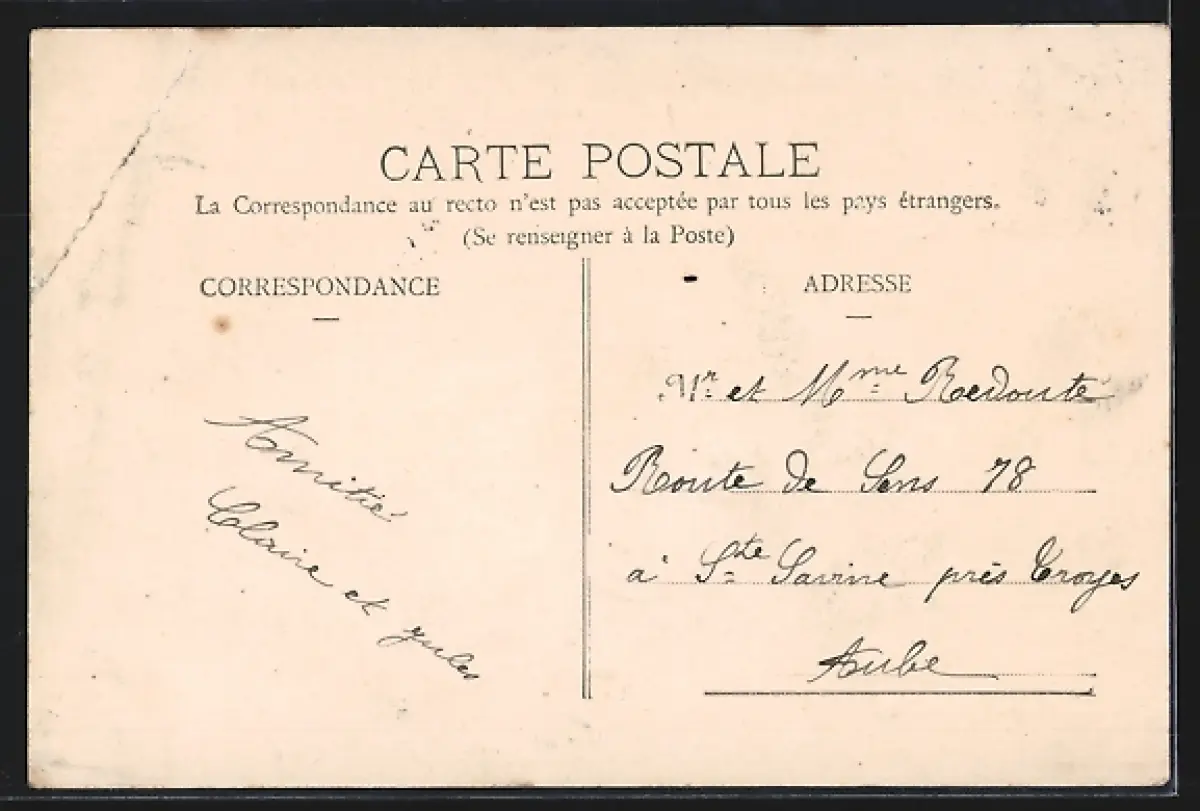Personenbezogene Daten auf der Rückseite der Karte wurden durch blauen Textmarker unkenntlich gemacht. Die blauen Stellen sind auf die Vorderseite durchgeweicht und wirken sich negativ auf das Postkartenfoto aus