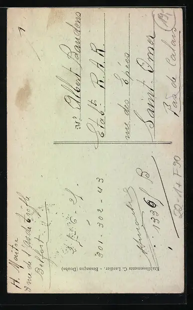 Personenbezogene Daten auf der Rückseite der Karte wurden durch blauen Textmarker unkenntlich gemacht. Die blauen Stellen sind auf die Vorderseite durchgeweicht und wirken sich negativ auf das Postkartenfoto aus