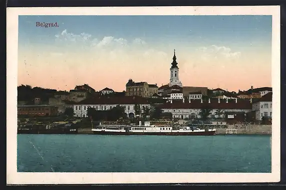 AK Belgrad, Blick über die Save auf die Ortschaft, Dampfer