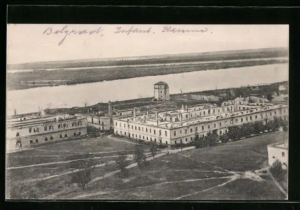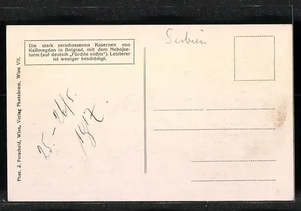 AK Belgrad, Die stark zerschossenen Kasernen von Kalimegdan mit dem Nebojseturm