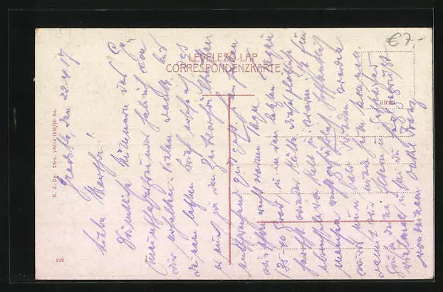 Personenbezogene Daten auf der Rückseite der Karte wurden durch blauen Textmarker unkenntlich gemacht. Die blauen Stellen sind auf die Vorderseite durchgeweicht und wirken sich negativ auf das Postkartenfoto aus