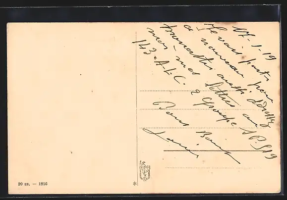 Personenbezogene Daten auf der Rückseite der Karte wurden durch blauen Textmarker unkenntlich gemacht. Die blauen Stellen sind auf die Vorderseite durchgeweicht und wirken sich negativ auf das Postkartenfoto aus