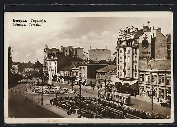 AK Belgrad, Strassenbahn mit Geschäften und Brunnen, Terazia