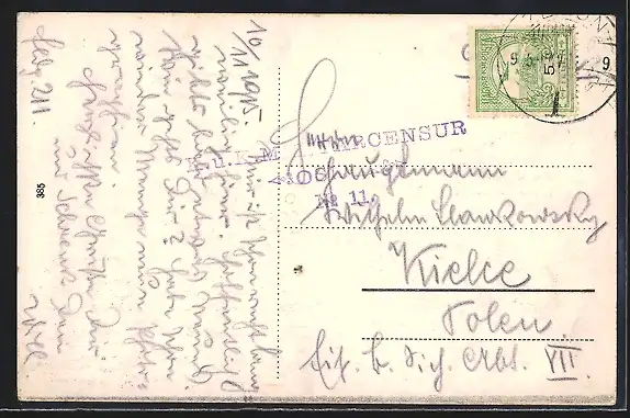 Personenbezogene Daten auf der Rückseite der Karte wurden durch blauen Textmarker unkenntlich gemacht. Die blauen Stellen sind auf die Vorderseite durchgeweicht und wirken sich negativ auf das Postkartenfoto aus