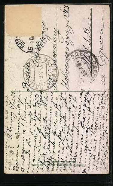 Personenbezogene Daten auf der Rückseite der Karte wurden durch blauen Textmarker unkenntlich gemacht. Die blauen Stellen sind auf die Vorderseite durchgeweicht und wirken sich negativ auf das Postkartenfoto aus