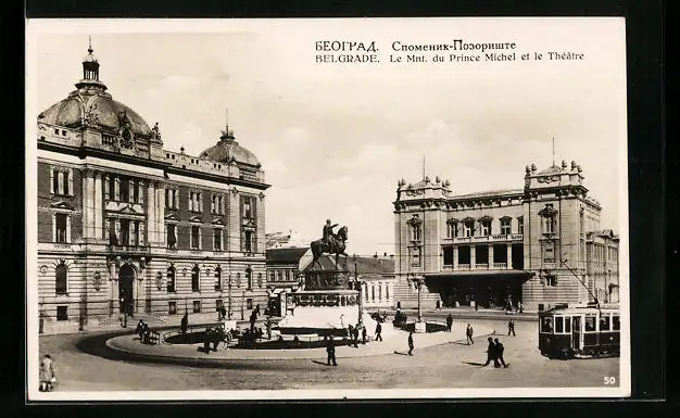 AK Belgrade, Le Mnt. du Prince Michel et le Theatre, Strassenbahn