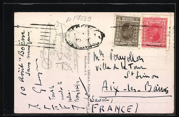 Personenbezogene Daten auf der Rückseite der Karte wurden durch blauen Textmarker unkenntlich gemacht. Die blauen Stellen sind auf die Vorderseite durchgeweicht und wirken sich negativ auf das Postkartenfoto aus