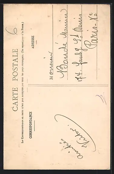 Personenbezogene Daten auf der Rückseite der Karte wurden durch blauen Textmarker unkenntlich gemacht. Die blauen Stellen sind auf die Vorderseite durchgeweicht und wirken sich negativ auf das Postkartenfoto aus