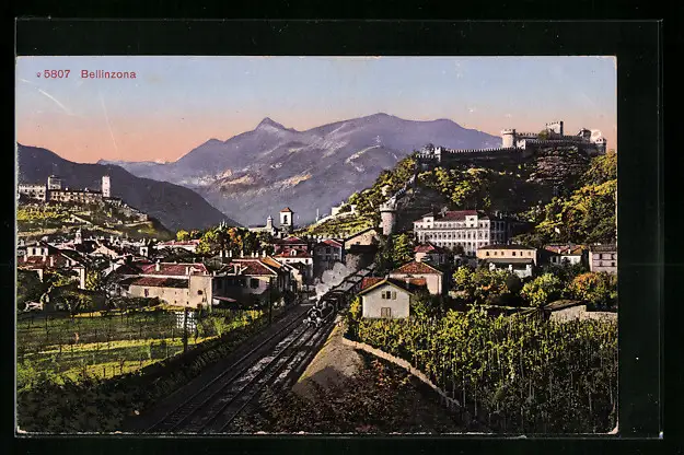 AK Bellinzona, Ortsansicht mit Dampfeisenbahn